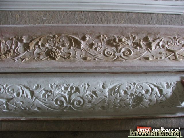 W kilku pałacowych pomieszczeniach na parterze założono tymczasową pracownię sztukatorską. Zachowane elementy są demontowane, ewidencjonowane, czyszczone i rekonstruowane. Zdarza się, że niektóre stiuki trzeba uzupełniać, korzystając z dokumentacji fotograficznej.